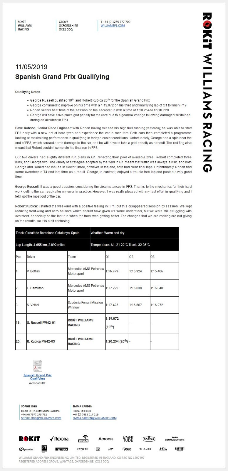 Formula 1 Emirates Gran Premio de Espana 2019 - informacja prasowa zespołu ROKiT Williams Racing po kwalifikacjach w Montmeló